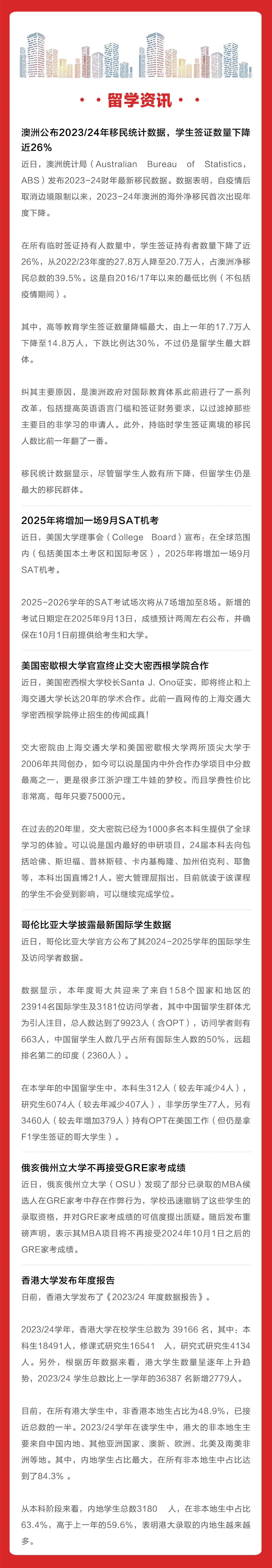 澳洲公布2023/24年移民统计数据,学生签证数量下降近26% 近日,澳洲统计局(Australian Bureau of Statistics,ABS)发布2023-24财年最新移民数据。数据表明,自疫情后取消边境限制以来,2023-24年澳洲的海外净移民首次出现年度下降。 在所有临时签证持有人数量中,学生签证持有者数量下降了近26%,从2022/23年度的27.8万人降至20.7万人,占澳洲净移民总数的39.5%。这是自2016/17年以来的最低比例(不包括疫情期间)。 其中,高等教育学生签证数量降幅最大,由上一年的17.7万人下降至14.8万人,下跌比例达30%,不过仍是留学生最大群体。 纠其主要原因,是澳洲政府对国际教育体系此前进行了一系列改革,包括提高英语语言门槛和签证财务要求,以过滤掉那些主要目的非学习的申请人。此外,持临时学生签证离境的移民人数比前一年翻了一番。 移民统计数据显示,尽管留学生人数有所下降,但留学生仍是最大的移民群体。 2025年将增加一场9月SAT机考 近日,美国大学理事会(College Board)宣布:在全球范围内(包括美国本土考区和国际考区),2025年将增加一场9月SAT机考。 2025-2026学年的SAT考试场次将从7场增加至8场。新增的考试日期定在2025年9月13日,成绩预计两周左右公布,并确保在10月1日前提供给考生和大学。 考试时间: 美国密歇根大学官宣终止交大密西根学院合作 近日,美国密西根大学校长Santa J. Ono证实,即将终止和上海交通大学长达20年的学术合作。此前一直网传的上海交通大学密西根学院停止招生的传闻成真! 交大密院由上海交通大学和美国密歇根大学两所顶尖大学于2006年共同创办,如今可以说是国内中外合作办学项目中分数最高之一,更是很多江浙沪理工牛娃的梦校。而且学费性价比非常高,每年只要75000元。 在过去的20年里,交大密院已经为1000多名本科生提供了全球学习的体验。可以说是国内最好的申研项目,24届本科去向包括哈佛、斯坦福、普林斯顿、卡内基梅隆、加州伯克利、耶鲁等,本科出国直博21人。密大管理层指出,目前就读于该课程的学生不会受到影响,可以继续完成学位。 哥伦比亚大学披露最新国际学生数据 近日,哥伦比亚大学官方公布了其2024-2025学年的国际学生及访问学者数据。 数据显示,本年度哥大共迎来了来自158个国家和地区的23914名国际学生及3181位访问学者,其中中国留学生群体尤为引人注目,总人数达到了9923人(含OPT),访问学者则有663人,中国留学生人数几乎占所有国际生人数的50%,远超排名第二的印度(2360人)。 在本学年的中国留学生中,本科生312人(较去年减少4人),研究生6074人(较去年减少407人),非学历学生77人,另有3460人(较去年增加379人)持有OPT在美国工作(但仍是拿F1学生签证的哥大学生)。 俄亥俄州立大学不再接受GRE家考成绩 近日,俄亥俄州立大学(OSU)发现了部分已录取的MBA候选人在GRE家考中存在作弊行为,学校迅速撤销了这些学生的录取资格,并对GRE家考成绩的可信度提出质疑。随后发布重磅声明,表示其MBA项目将不再接受2024年10月1日之后的GRE家考成绩。 香港大学发布年度报告 日前,香港大学发布了《2023/24 年度数据报告》。 2023/24学年,香港大学在校学生总数为 39166 名,其中:本科生18491人,修课式研究生16541 人,研究式研究生4134 人。另外,根据历年数据来看,港大学生数量呈逐年上升趋势,2023/24 学生总数比上一学年的36387 名新增2779人。 目前,在所有港大学生中,非香港本地生占比为48.9%,已接近总数的一半。2023/24学年在读学生中,港大的非本地生主要来自中国内地、其他亚洲国家、澳新、欧洲、北美及南美非洲等地。其中,内地学生占比最大,在所有非本地生中占比达到了84.3% 。 从本科阶段来看,内地学生总数3180 人,在非本地生中占比63.4%,高于上一年的59.6%,表明港大录取的内地生越来越多。