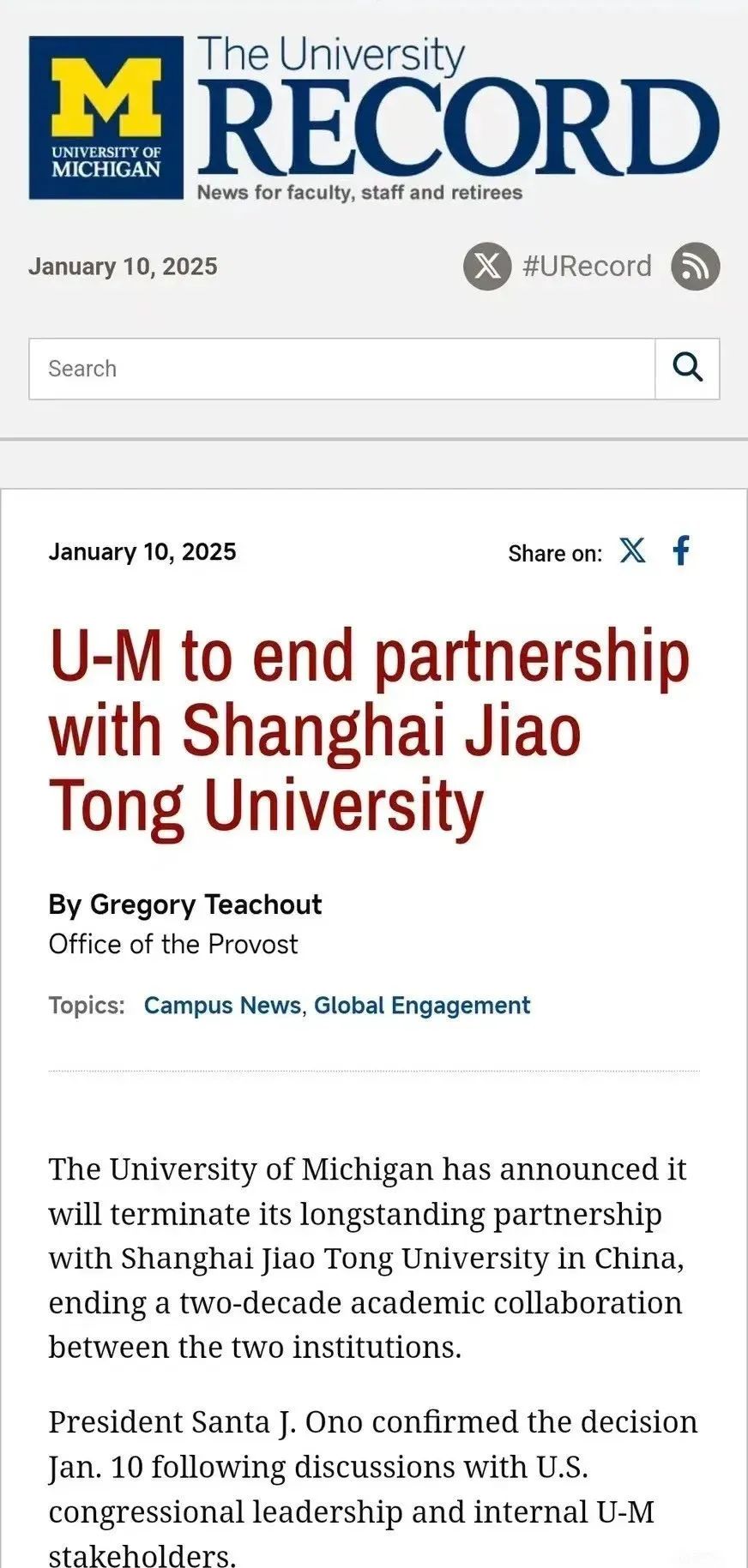 ·美国密歇根大学官宣终止交大密西根学院合作