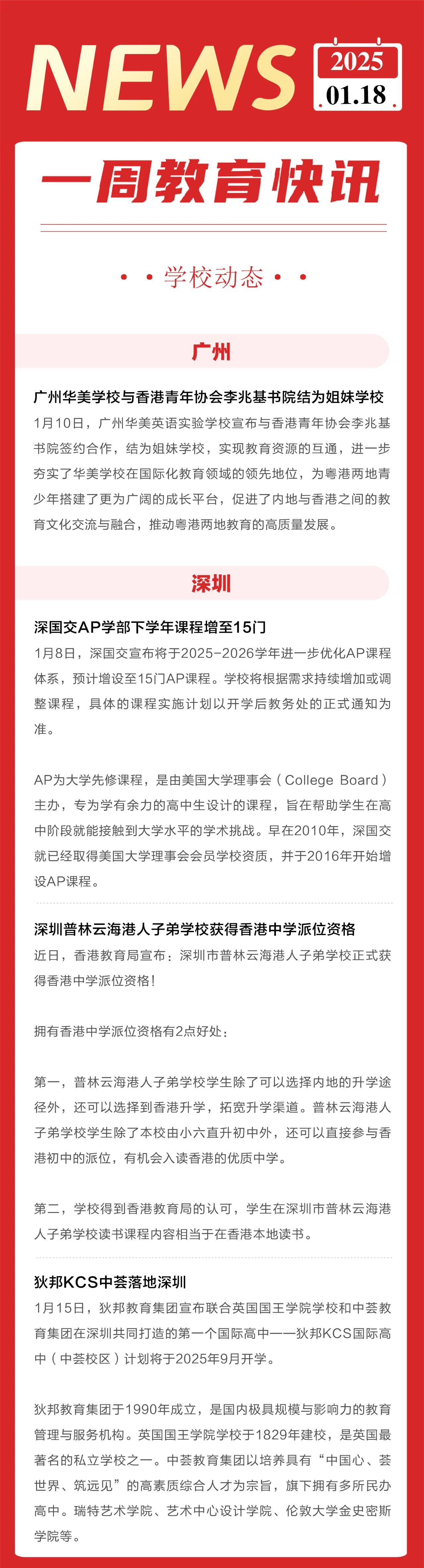 学校动态 广州 广州华美学校与香港青年协会李兆基书院结为姐妹学校 1月10日,广州华美英语实验学校宣布与香港青年协会李兆基书院签约合作,结为姐妹学校,实现教育资源的互通,进一步夯实了华美学校在国际化教育领域的领先地位,为粤港两地青少年搭建了更为广阔的成长平台,促进了内地与香港之间的教育文化交流与融合,推动粤港两地教育的高质量发展。 深圳 深国交AP学部下学年课程增至15门 1月8日,深国交宣布将于2025-2026学年进一步优化AP课程体系,预计增设至15门AP课程。学校将根据需求持续增加或调整课程,具体的课程实施计划以开学后教务处的正式通知为准。 AP为大学先修课程,是由美国大学理事会(College Board)主办,专为学有余力的高中生设计的课程,旨在帮助学生在高中阶段就能接触到大学水平的学术挑战。早在2010年,深国交就已经取得美国大学理事会会员学校资质,并于2016年开始增设AP课程。 深圳普林云海港人子弟学校获得香港中学派位资格 近日,香港教育局宣布:深圳市普林云海港人子弟学校正式获得香港中学派位资格! 拥有香港中学派位资格有2点好处: 第一,普林云海港人子弟学校学生除了可以选择内地的升学途径外,还可以选择到香港升学,拓宽升学渠道。普林云海港人子弟学校学生除了本校由小六直升初中外,还可以直接参与香港初中的派位,有机会入读香港的优质中学。 第二,学校得到香港教育局的认可,学生在深圳市普林云海港人子弟学校读书课程内容相当于在香港本地读书。 狄邦KCS中荟落地深圳 1月15日,狄邦教育集团宣布联合英国国王学院学校和中荟教育集团在深圳共同打造的第一个国际高中——狄邦KCS国际高中(中荟校区)计划将于2025年9月开学。