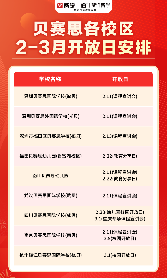 贝赛思各校区2-3月开放日安排来啦~感兴趣的家庭记得报名,备考规划可私我了解