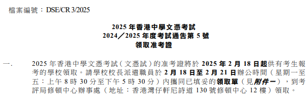 2025年DSE准考证将于近日发放,其中学校考生由所在学校于2月18至2月21日统一领取,自修生的准考证将以邮寄的形式寄送到报名时预留的地址,考生们记得及时查收哦!