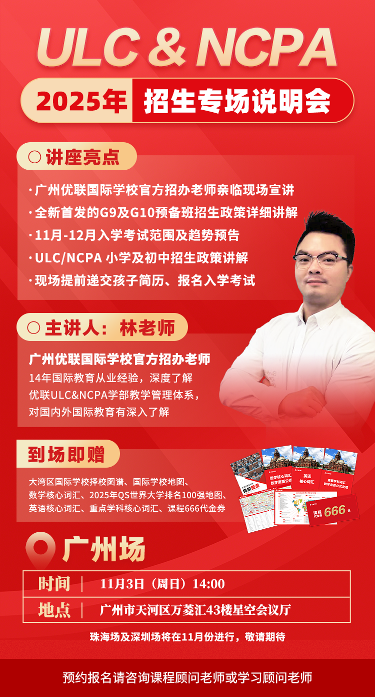 ULC&NCPA2025年招生专场说明会来啦!11月3日(周日)下午14:00,广州天河万菱汇校区!官方招办主任亲临现场面对面直击最新的招生政策及入学考试内容!意向参加11月/12月考试的同学千万不要错过咯!名额有限,赶紧联系我预约抢位吧!
