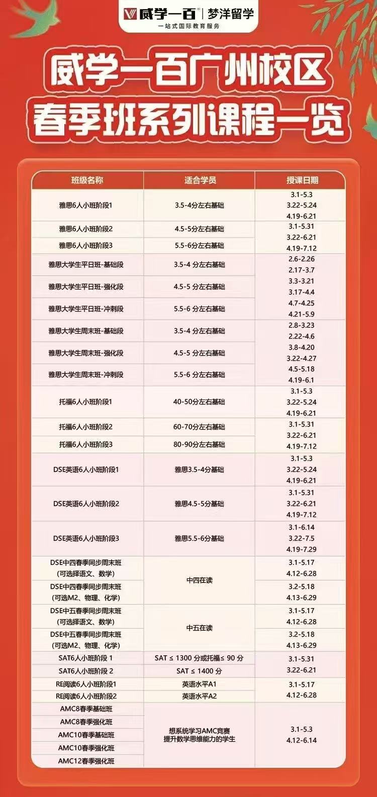 威学一百广州校区春季班火热招生中!雅思/托福/DSE/RE/AMC等热门课程应有尽有,适配各阶段学员需求!快来戳我了解课程详情啦~